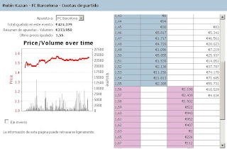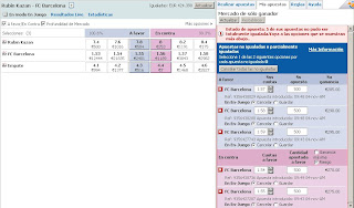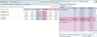 Para hoy voy a tocar el partido del Rubin Kazan y el Barcelona. En las cuotas de partido el Barça tiende a subir, por lo que voy a intentar ir pillando tick a tick hacia arriba. Coloco una serie de apuestas back a 1.57,1.58,1.59 y de momento lay a 1.54 y 1.55. Si sigue subiendo iré cerrando cada back con un lay un tick por debajo, a no ser que consiga que me pillen los lays primero y entonces el movimiento será al revés. Esta es una cuota que fácilmente puede moverse entre 1.53 y 1.60 a lo largo del día.