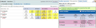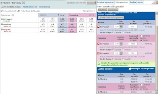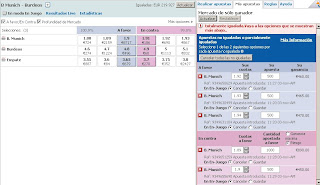 En el del Bayern la cosa estaba tranquila a 1.93-1.94 cuando de repente ha entrado a saco alguien que se comido enterito hasta el 1.98, para después seguir subiendo hasta el 2.04, cuota a la que se han cruzado 20.000€. Después hacia abajo, hacia arriba, hacia abajo... Y yo dando tumbos en medio, hasta que he decidido cerrar com algunas pérdidas, que pueden verse en el pantallazo. No me caben las apuestas individuales que he ido haciendo por lo que he marcado la casilla de cuotas medias.
