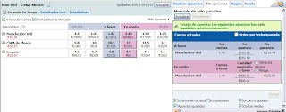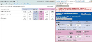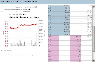 Ha subido una décima (10 ticks) casi ininterrumpidamente. Es cierto que el Manchester tiene ya encarrilada la clasificación, pero el CSKA no está precisamente para tirar cohetes, con la reciente decapitación de Juande Ramos,y en Moscú al Manchester le bastó con dejar correr el partido para al final llevarse la victoria con los reservas. Ante el partidazo que se les avecina el domingo frente al Chelsea no creo que el Manchester salga tampoco hoy con sus mejores jugadores, de hecho parece que las bajas con las que contarán (Rio Ferdinand, Nemanja Vidic, Ji-sung Park y Ryan Giggs, mientras Dimitar Berbatov es duda, así como Rooney, que fue papá ayer y no se sabe si jugará) son la razón de la subida de la cuota. Pero habrá que ver si la tendencia se mantiene o si se da la vuelta con fuerza poco antes de que comience el partido. De momento parece que a 1.46 se está estableciendo una resistencia, aunque en estos partidos, en los que todavía quedan por entrar algunos millones de euros, hay que ser cautelosos y es mejor ir estudiándolo durante el día y esperar el momento oportuno para entrar en el mercado. Una hora antes del inicio del partido puede haber buenas oportunidades, si se acierta en la tendencia seguro que se pueden aprovechar 4 o 5 ticks.